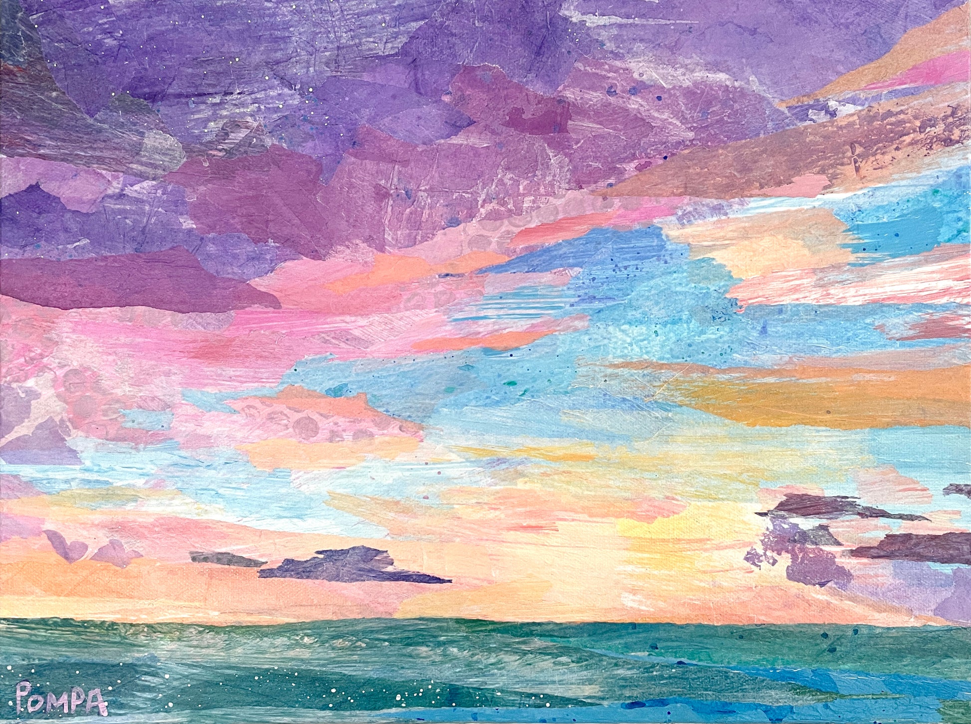 Relax as the sun sets and the sky fills your heart with gratitude. This collage uses painted and torn tissue paper on a stretched canvas, with the image wrapping around the frame for easy hanging.